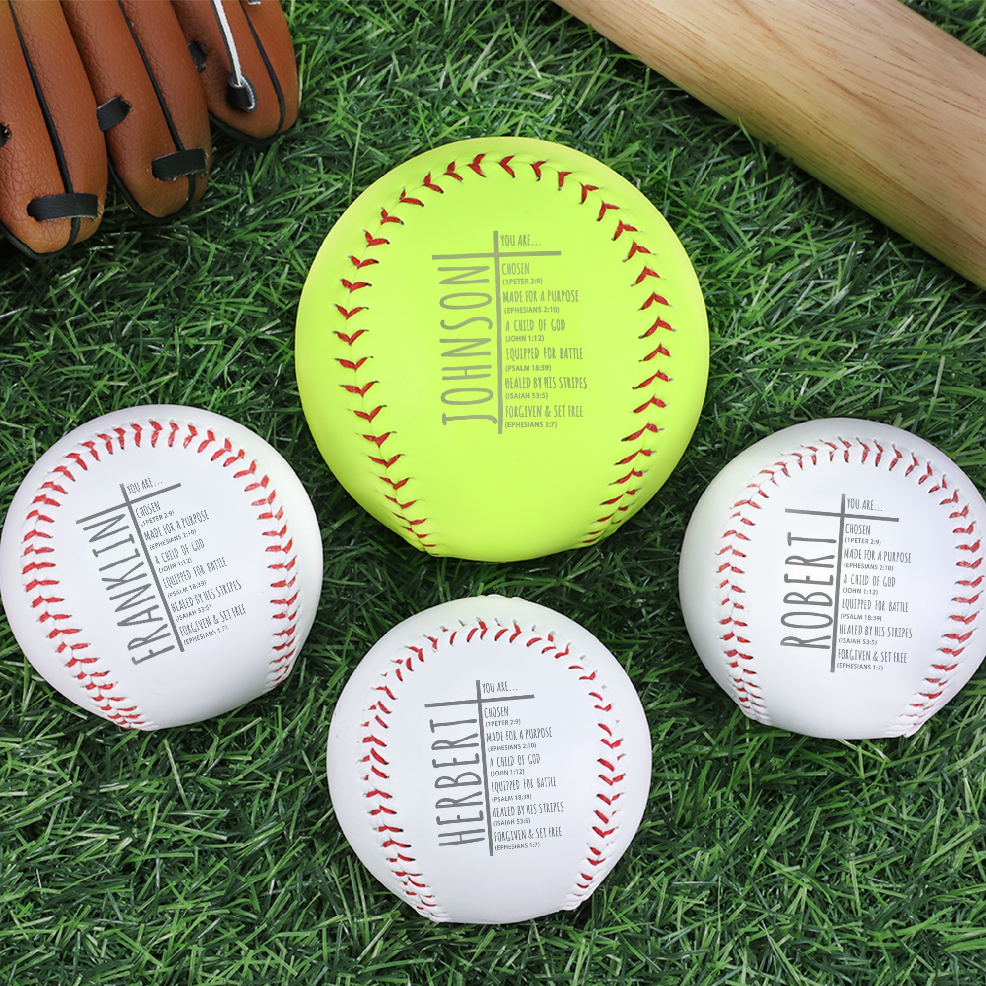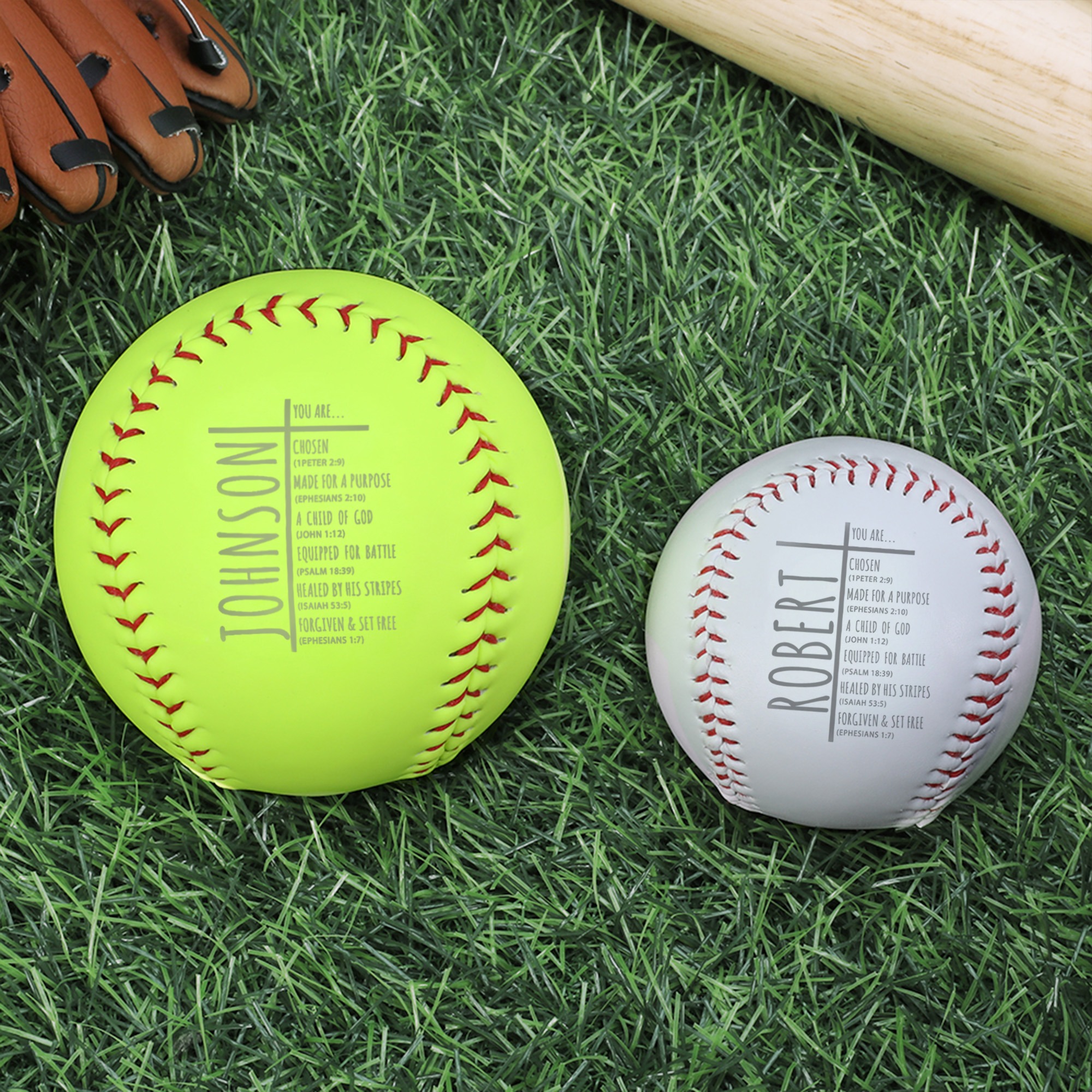 Faith-Inspired Design - This baseball or softball features a cross and carefully chosen Bible verse, paired with a classic stitched look. The faith-themed design brings spiritual meaning to the game, blending sports and personal belief in a memorable way.