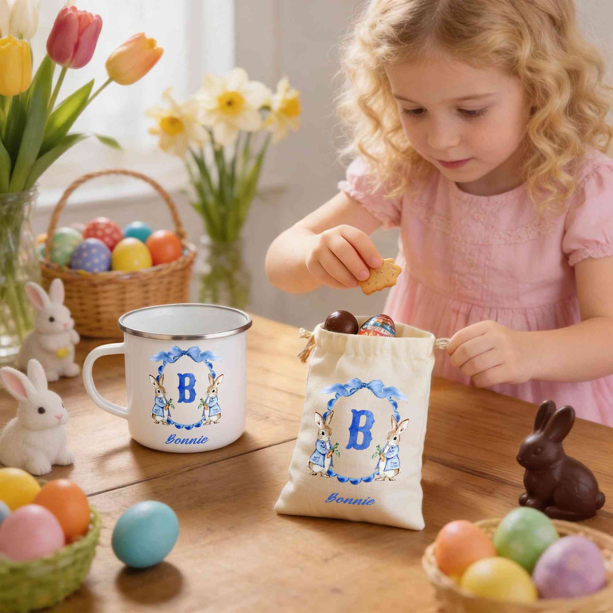Custom Name Peter Rabbit Bow Wreath Alphabet Easter Enamel Mug & Storage Bag Set |